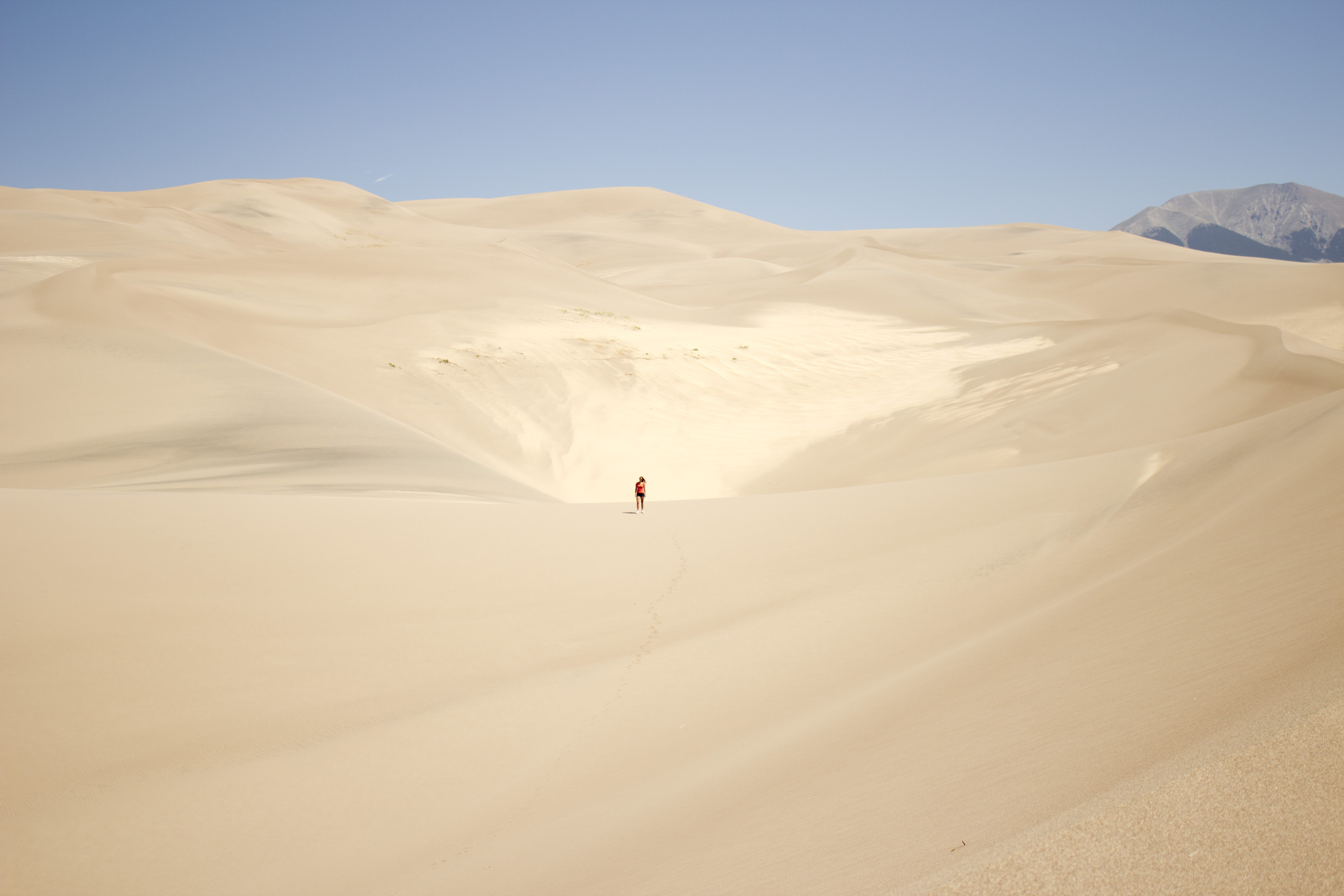 We ditched the tube and resumed our climb. The sand grew more dry and packed, but the sun was getting hotter and the slopes steeper. Ten decided to wait below, while I continued the trek upward. I started setting goals for myself: Ok, just make it to that little scrub patch up there and then you can catch your breath. The air was noticeably thinner. I began to stop more and more often to rest. I set a new goal for myself: reach the peak of this immediate dune. It wasn’t quite the topmost spot on the Dunes, but it was pretty high up.