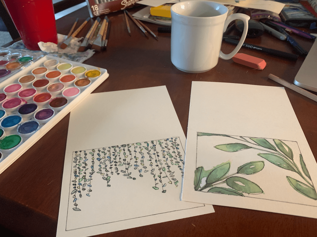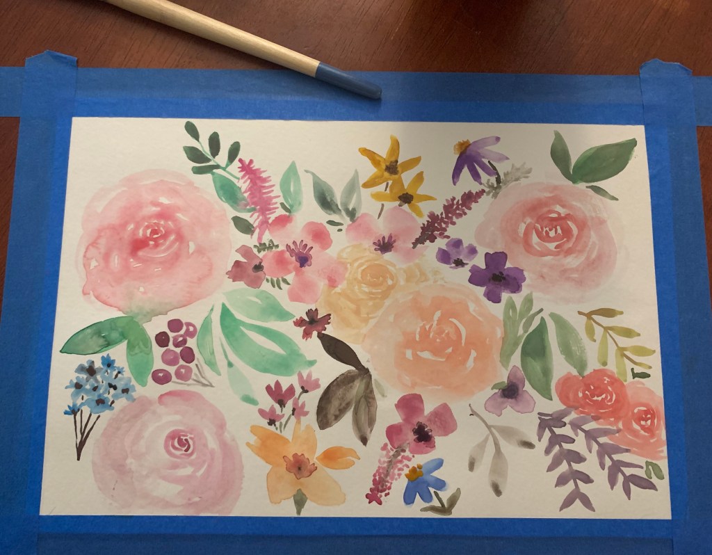 Now, I definitely didn’t need to pay ten bucks for a class. The personal interaction was sweet and it was great to feel like I was supporting the artistic community, but tbh there are so many great resources on YouTube. This video includes all the basic watercolor techniques we learned in our $10 class. And this one is a great one for making small flowers (actually, everything on Shayda Campbell’s channel is magic). Lauren and I have been sharing videos and our latest endeavors with each other since that first class. It’s nice to have some accountability (and encouragement) along the way.