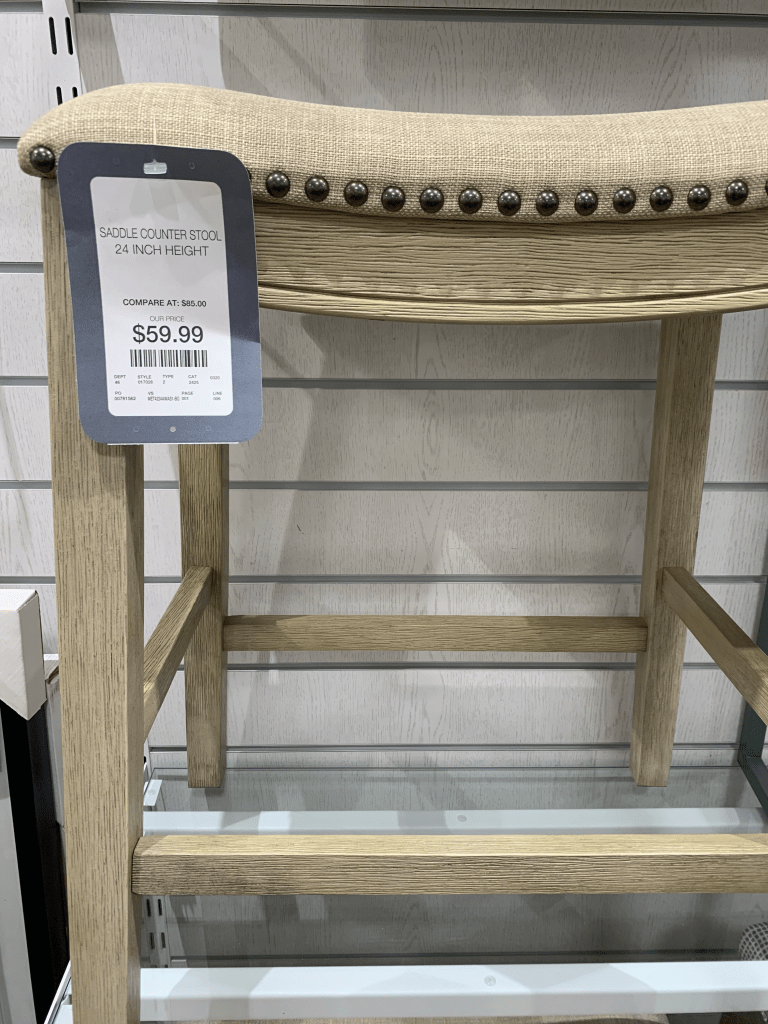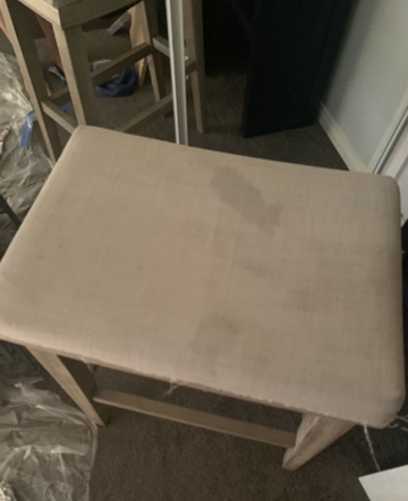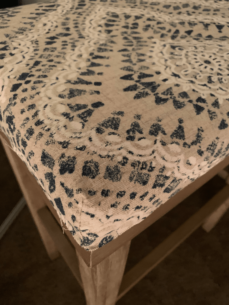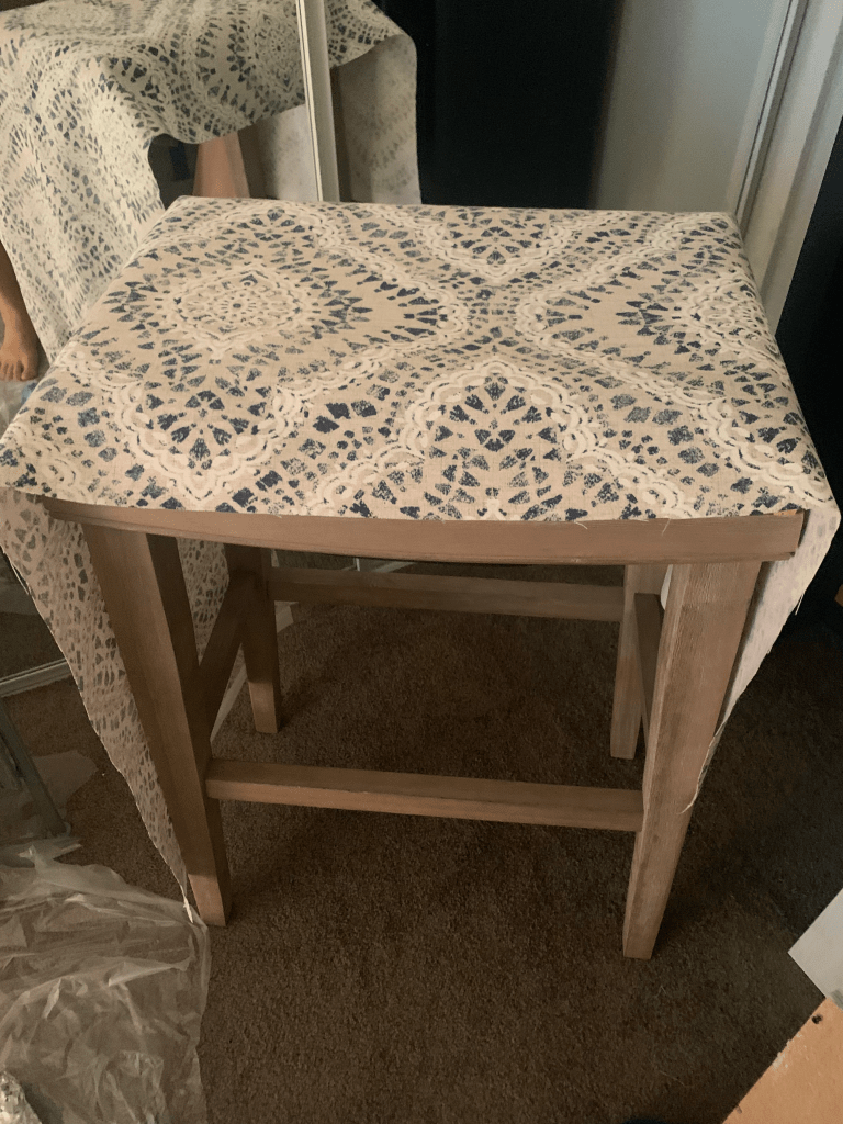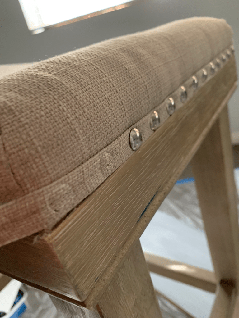 After skipping a week’s worth of cheap laminate tv consoles and broken picture frames, I finally came across a worthwhile piece: a cute, slightly stained, modern farmhouse-style counter stool. A few years ago, I reupholstered all of my dining table chairs so I thought there was a chance I could restore this little beauty. I dragged it upstairs and got to work.