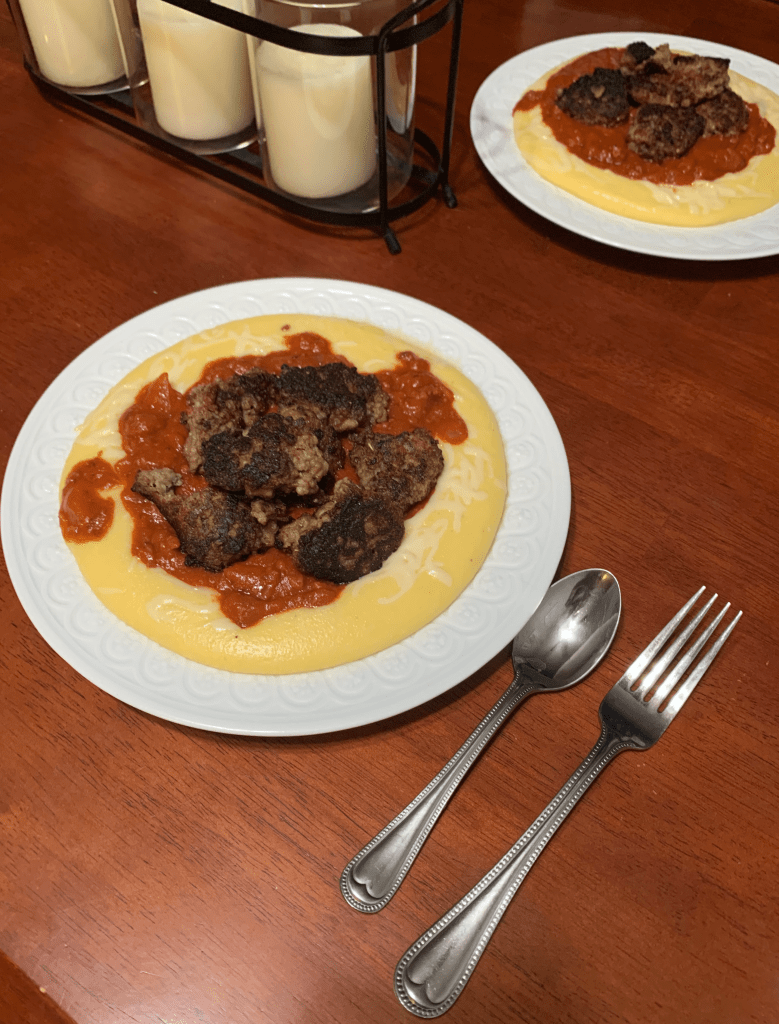 Polenta with Homemade Meatballs — I had some leftover Stromboli filling to use up, so I decided to use it as a sauce for a polenta dish. My mother-in-law got me hooked on ooey, gooey polenta and I used my mom’s meatball recipe— quite the family affair! Here’s our family meatball recipe:
