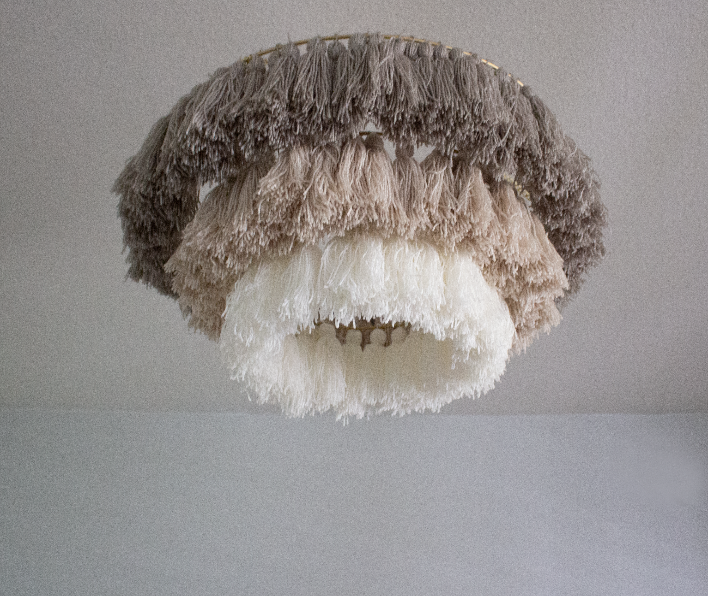 7. Building the chandelier was a little challenging. I divided the tassels into even sections so the sides would all be balanced. I used wire in between each section to connect the largest level to the mid level and the mid to lower (note: I used string initially, but it was tough to keep in place and didn’t offer the support that wire offered). There was a lot of scooching involved.