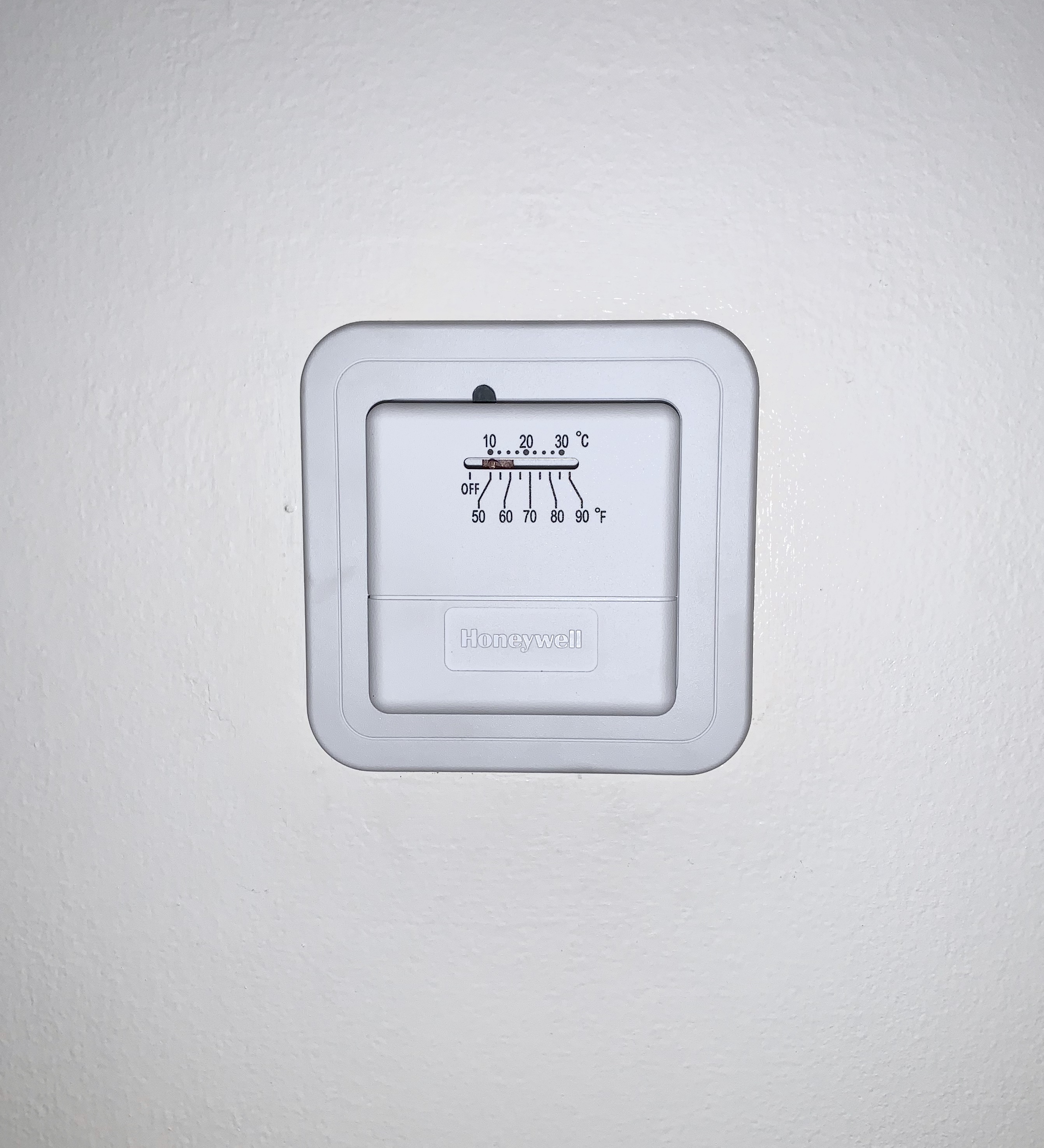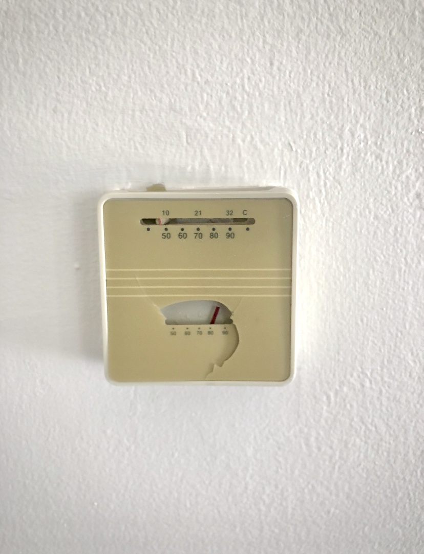 I went back into the dark, no-longer-air-conditioned house, and started prying off the old thermostat. With a little jiggling, the cover popped off the wall. I then unscrewed the panel and carefully unscrewed the two wires connected to the plate (an “R” and a “W”). I connected the wires to the new panel and screwed it into the wall… before realizing there was a “cover plate” that would hide the part of the wall where the old thermostat had rested. So, I took the panel off, put the cover on, then reattached the wires, and screwed it all into the wall. Whew. Second times a charm, eh? Then, I turned back on the electricity, crossed my fingers, and turned the heat on. It worked.
