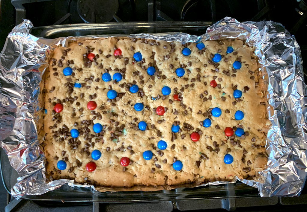This is such a fun alternative to chocolate chip cookies. The bars stay so gooey in the center, but the edges get crispy. There’s a little something for everyone in a crowd! You can add some M&M’s on top for a festive touch (this batch was from July– I forgot to take a picture of this week’s version).