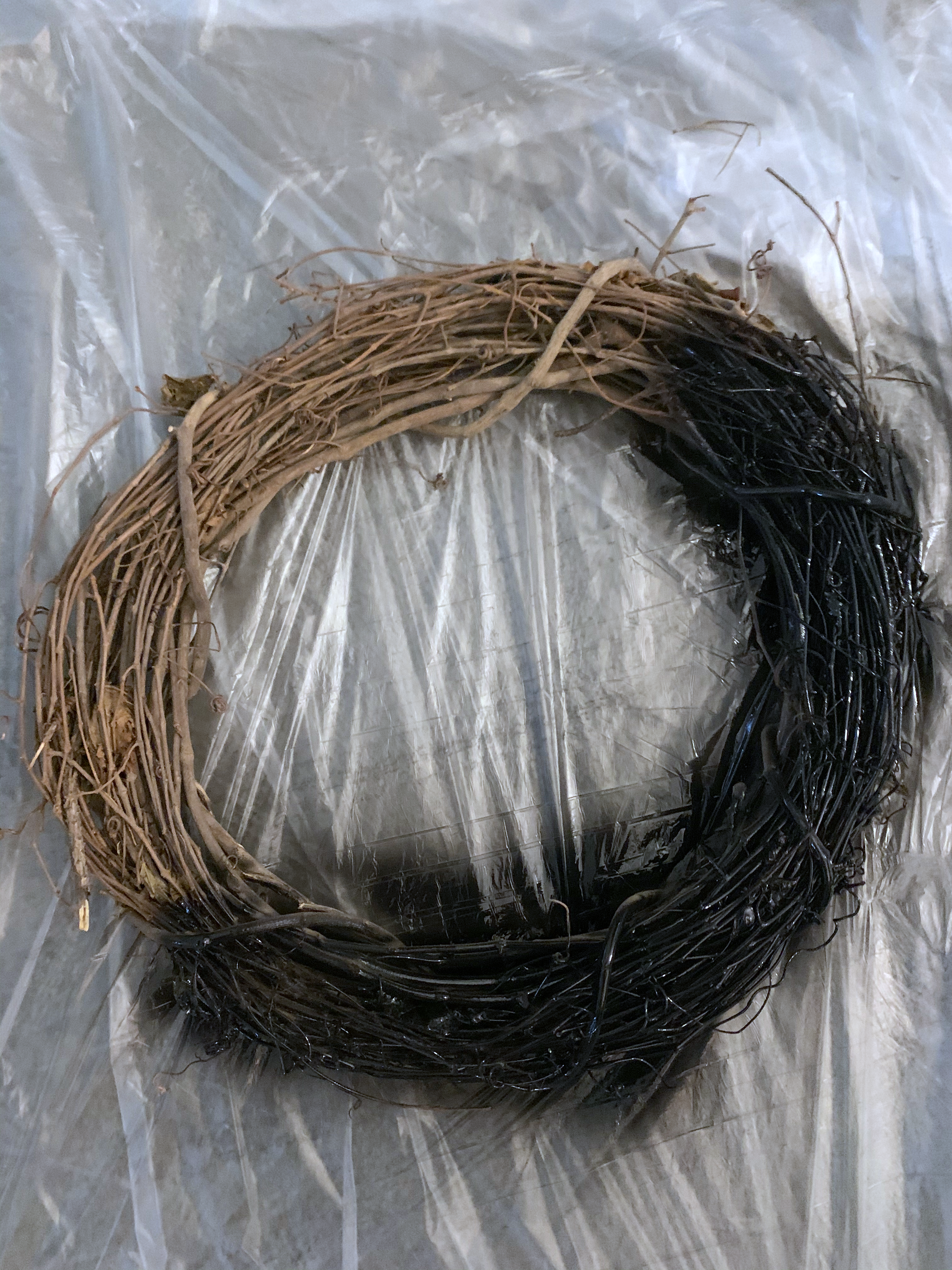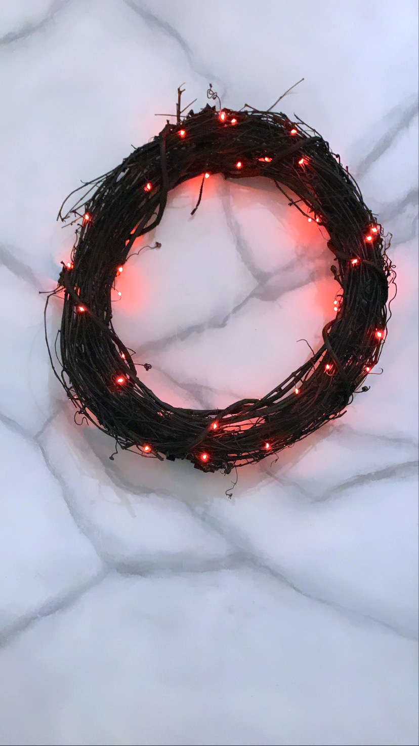 My final project to date was a wreath for the door. While I usually don’t bother opening marketing emails, I happened to notice that JoAnn Fabrics had an 18” wreath on sale for $2.50I I couldn’t pass that one up, so I immediately drove to my nearest JoAnn. I also grabbed a a pack of faerie lights (on clearance for $3.50). Once I got home, I spray-painted the wreath matte black to match the rest of my décor. While the paint dried, I cut out flower petals and leaves, following a number of tutorials online (type “DIY Paper Flowers” into a Pinterest search. You won’t be disappointed). I wrapped the faerie lights carefully around the wreath, then secured the flowers with hot glue. I had no idea what I was doing, I just kept adding flowers until I liked the look! I hung it on our front door and, while I’m happy with the wreath, it’s a little hard to appreciate the black detail against the black front door. Someone suggested adding gold or white tips to make it stand out more, along with some bats to add to the spookiness! I’ll be working on those updates in the next few weeks.